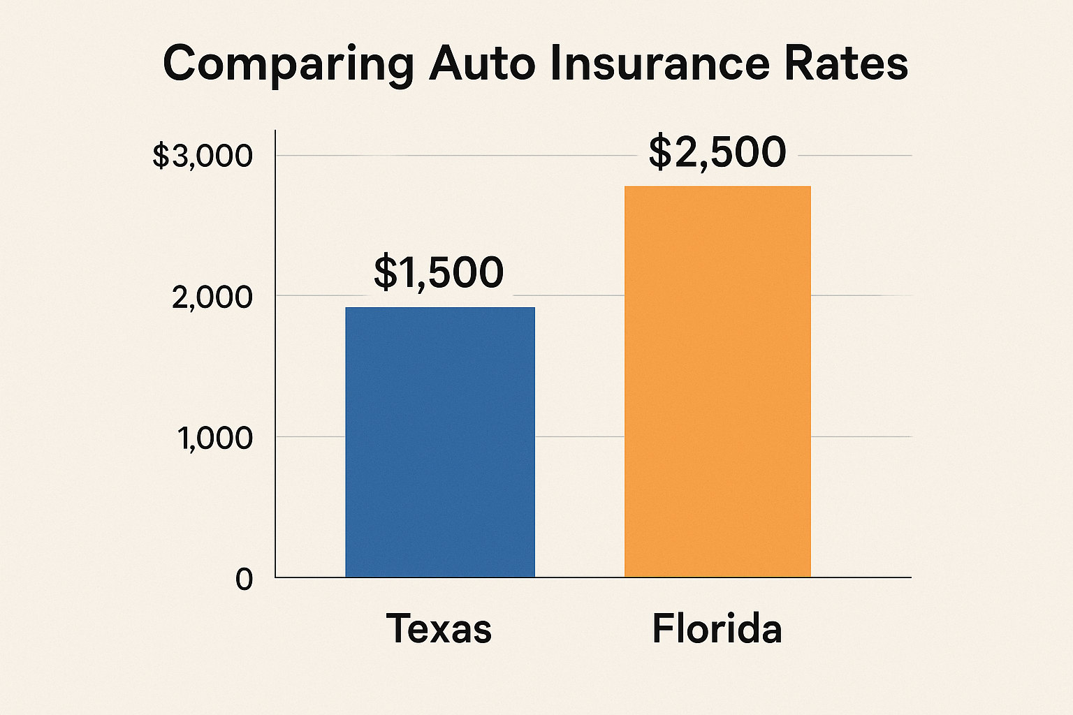 In Texas, rates tend to be somewhat lower, usually averaging about 1,800 to 2,000 dollars per year, depending on your city and driving history. Although Texas also faces risks like hailstorms and dense urban traffic, the state’s insurance markets are competitive, which can help keep rates in check for careful drivers. Overall, while Texans may pay less than Floridians on average, both states remain above the national average for auto insurance rates.